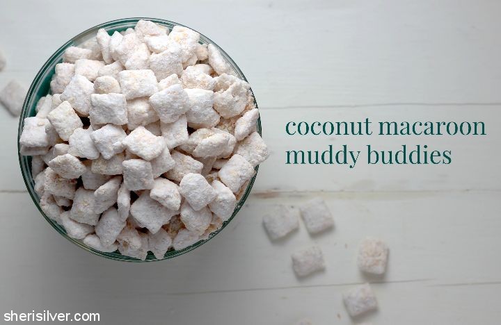 If you like coconut, you have to try this. Coconut Macaroon Muddy Buddies by Sheri Silver.