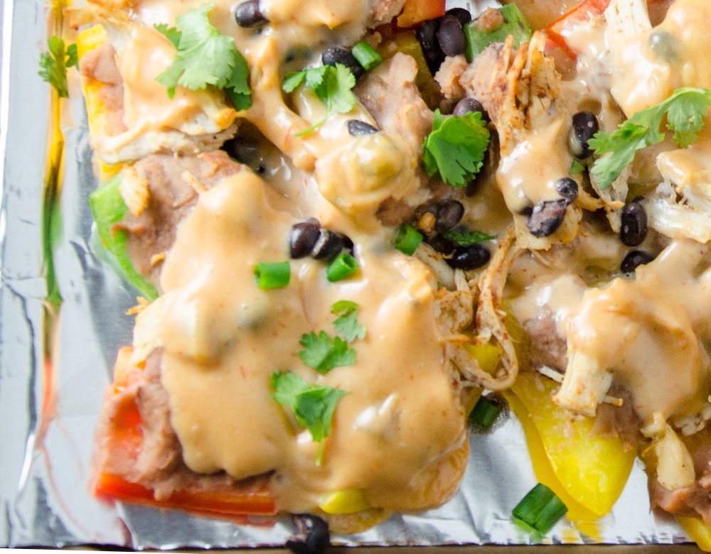 - Sprinkle black beans & shredded chicken over nachos. Drizzle the cheese sauce over everything.