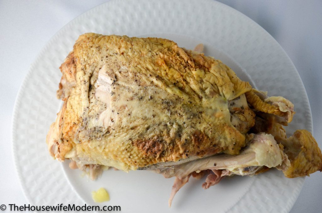 Another thing I like is that this is one way we really, really stretch a dollar. I buy a whole chicken (on sale, of course). Buying a whole chicken is the cheapest per pound (versus buying legs, etc.). I roast it, and the first two days husband eats the legs and thighs, his favorite part. Then I chop off most of the rest of the meat and make chicken pot pie. But wait…we’re still not done. I throw the scraps, including all the bone (yep, the whole chicken) in a Ziploc in the freezer. I use the chicken scraps (and leftover vegetable scraps) to make chicken stock. (You know the post I did 2 days ago! You can find it here.). Yep, two great meals plus free broth out of one chicken.