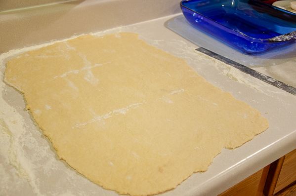 I did NOT include every step below. A lot of them are self-evident. I did include the rolling out the dough, rolling, and cutting. Just so you can see what it’s supposed to look like. I know the 18″ by 30″ seems REALLY large the first time you make it!