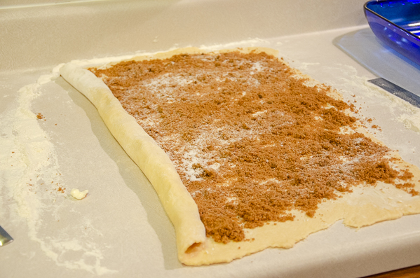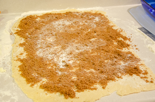- Spread the very soft butter over the surface of the dough. Sprinkle with pre-mixed brown sugar and cinnamon.