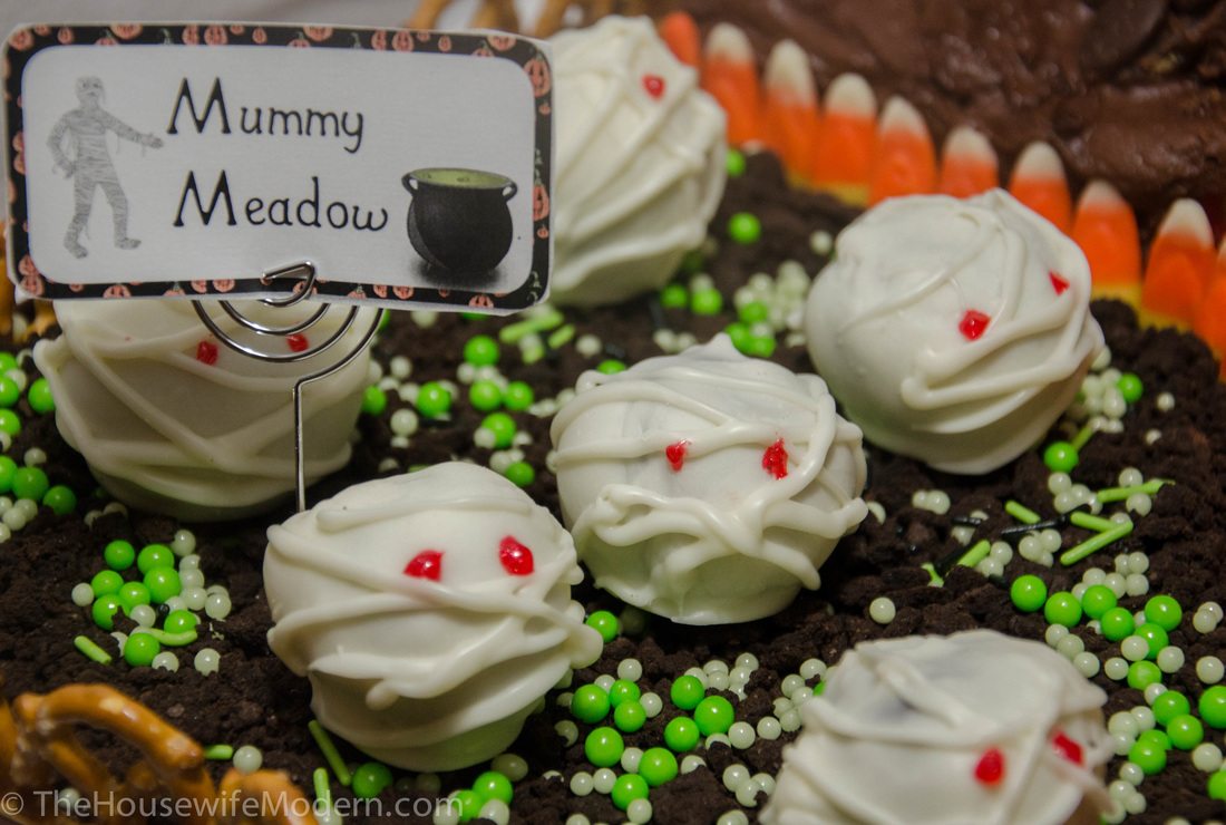 6) Mummy Meadow: crushed oreos sprinkled as base. Green sprinkles and little decorating balls for grass. Place the mummies.