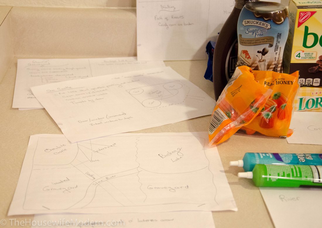 Mise en place has never been more important. I drew out the plans (It is quite obvious I am no one’s architect…but it gets the idea across). Then I gave each section it’s own “page” listing what was going into it. For example: Buckeye Lake had not only all of the the ingredients for the buckeyes, but also blueberry syrup, blue glitter gel, and extra M&M’s for the coastline.
