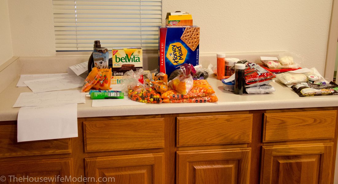 After I purchased the ingredients, I sorted them on the counter by section (again). Then I double-checked and made sure I had everything! (Note that the brownies and two red velvet cakes had been made the day before).
