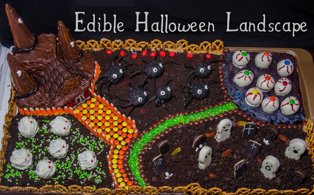 7) Spider’s Nest: crushed oreos sprinkled as base. Red sparkles to give some slight contrast. Red candies as bushes along the border. Place the spiders. Have fun getting the legs to stay.