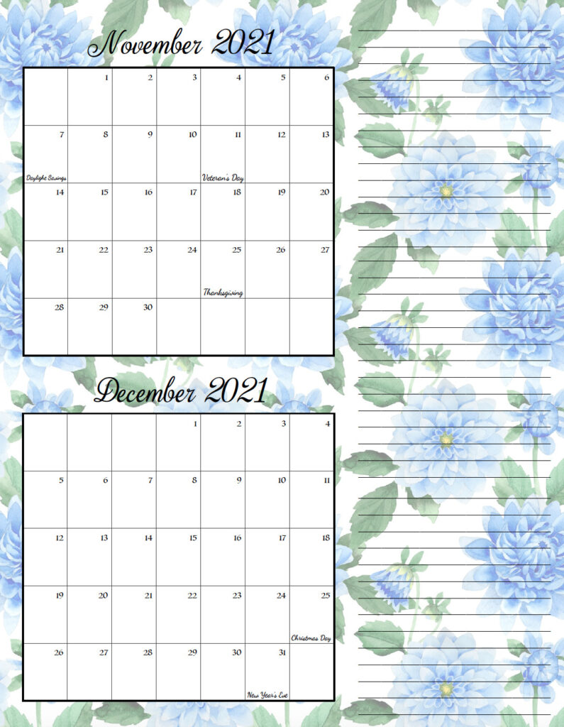 • The files are in pdf below. There is one file for the holiday-themed and another for the floral-themed. (You can find them below the images for each calendar).