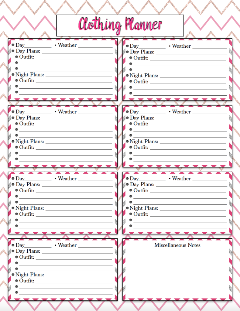 This is the travel clothing planner. There are spots for day and night outfits, the date, expected weather, and any notes about plans!