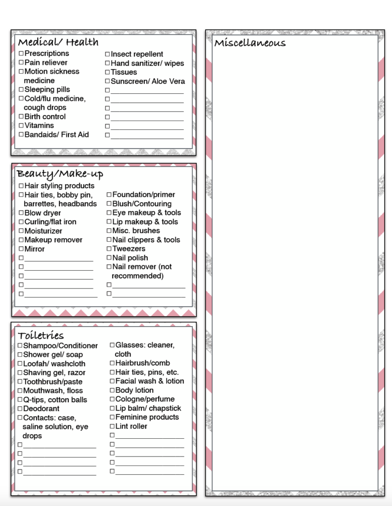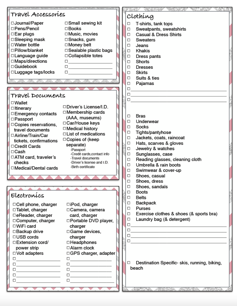 Please note, I have never brought every single item on this list on a vacation. I just cross out the ones I don’t need; most of the document/finance will only be needed with overseas trips, some of the travel accessories are more useful if you’re flying, most men will not use the make-up stuff, etc. This is an overly-exhaustive list. The way the formatting worked out, there is also a entire blank column for you to write in your own items.