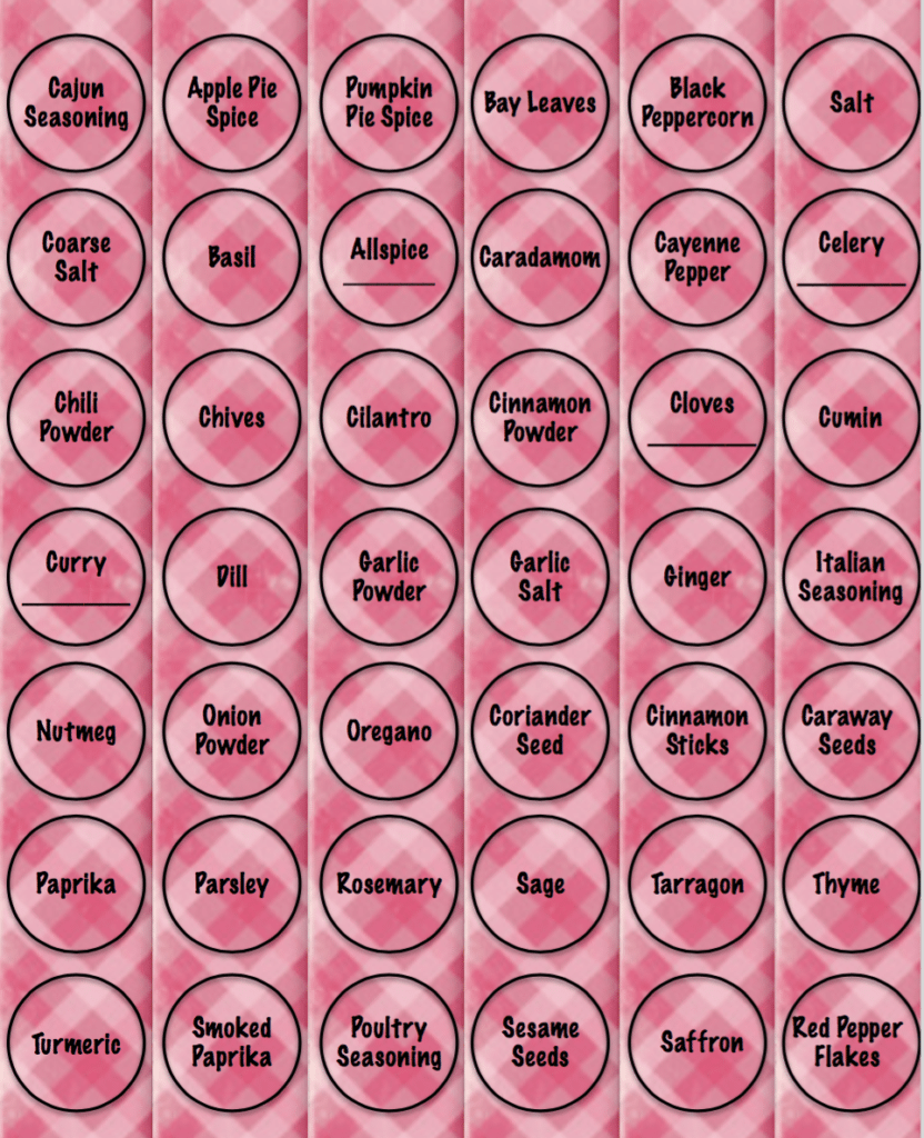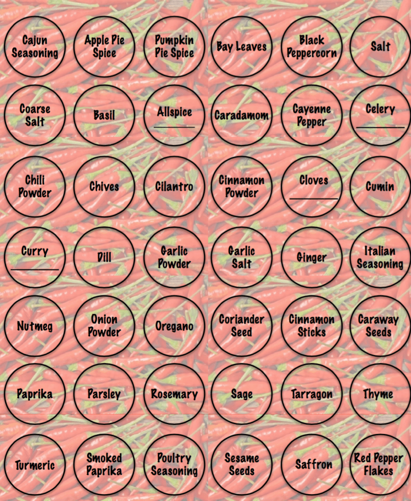 For the spice jar labels, there are three different designs. All three designs have a page with the spices pre-printed as well as an additional page of blanks.
