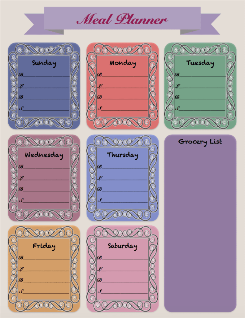 While the meal planners have been popular, I have had multiple requests for a combined meal planner/grocery list. Below are two different templates. I’m working on three more, so look for them in the future. I was originally planning on doing just one post….but I can’t keep up with content if I have to put in 10 hours for each post. Plus I needed a break from design.