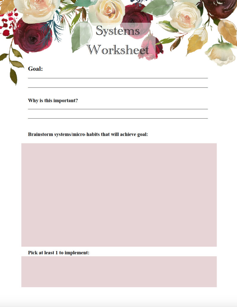 That’s what this printable is for. You can tackle this whole goals vs. systems thing by embracing both. I specifically designed this worksheet to maximize the use of the systems, while still holding you accountable to achieve your long-term goals.