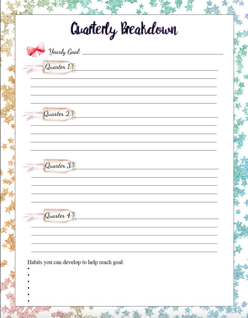 Quarterly breakdown- break down current year’s goal by quarter and identify habits that will help you reach goal.