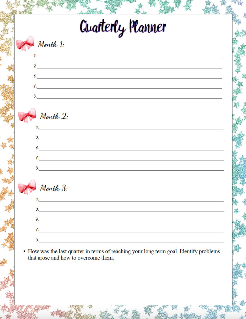 Quarterly planner- break down current quarter into monthly actions that need to be completed.