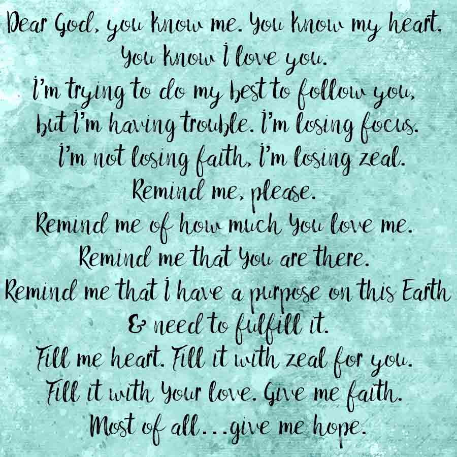 Dear God, you know me. You know my heart. You know I love you. I’m trying to do my best to follow you, but I’m having trouble. I’m losing focus. I’m not losing faith, I’m losing zeal.
