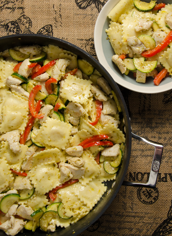 - Add chicken and ravioli to vegetables in skillet. Toss with pesto. Serve immediately.