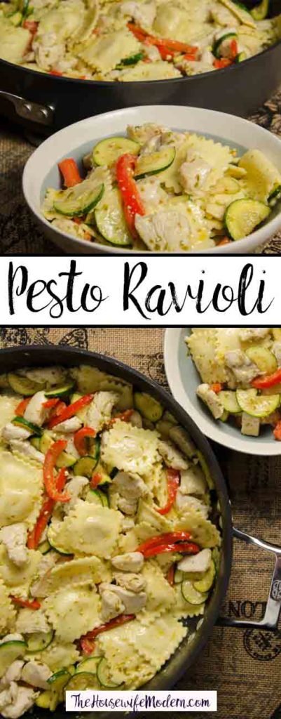 The basic version of Pesto Ravioli has been in my cookbook so long I’m not even sure where it came from. A quick internet search brought up the likely source: Betty Crocker. As always, I took some slight liberties…but not many. This recipe is fabulous not just because it tastes great, but because it’s easy. Amazingly easy. It’s a great go-to on a busy night. Plus, with chicken, veggies, and pasta, you don’t need a side dish!