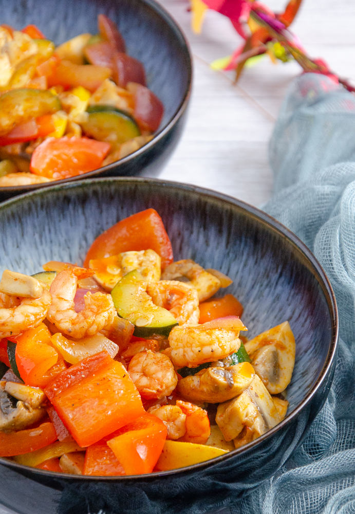 I try to limit the amount of oil used in this recipe. But when sautéing the vegetables, it sometimes gets “dry.” I usually use a bit (or all) of the marinade. It adds a ton of flavor and doesn’t add a ton of fat. But you can also use small amounts of water or broth if you find the recipe flavor too strong. In that case, drain the shrimp before adding them to the recipe.