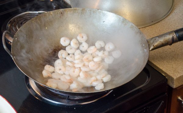- Place wok on large burner. Turn heat on medium-high. Allow to warm. Add 2 tsp. oil to wok. Add shrimp. Cook for 3-5 minutes, stirring constantly. When done, remove and keep warm.