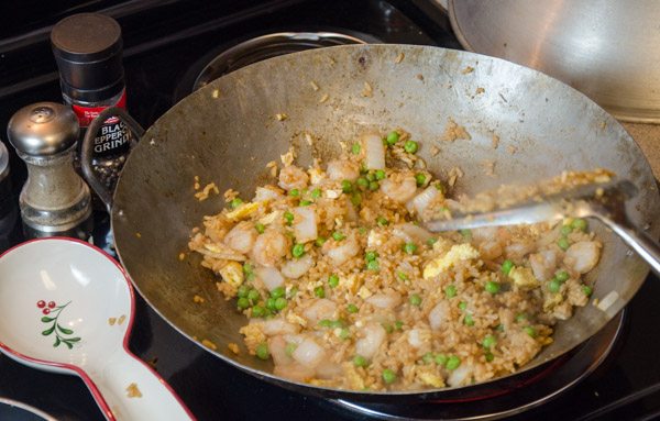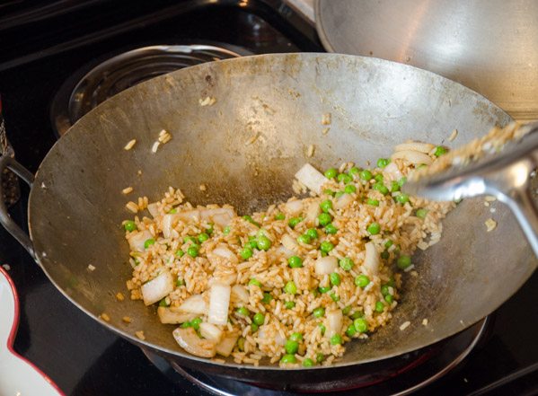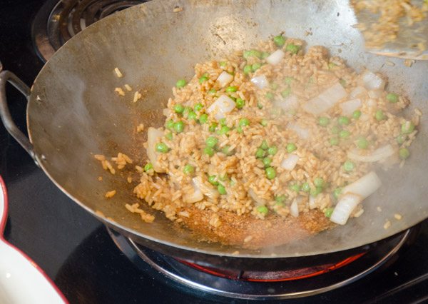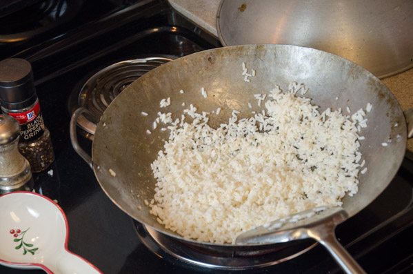 - Add rice, 3 Tbsp. water, garlic, and ground ginger to wok. Toss for 2-3 minutes or until ingredients are well-mixed. The rice also needs to actually “fry” a bit; don’t worry about some sticking.