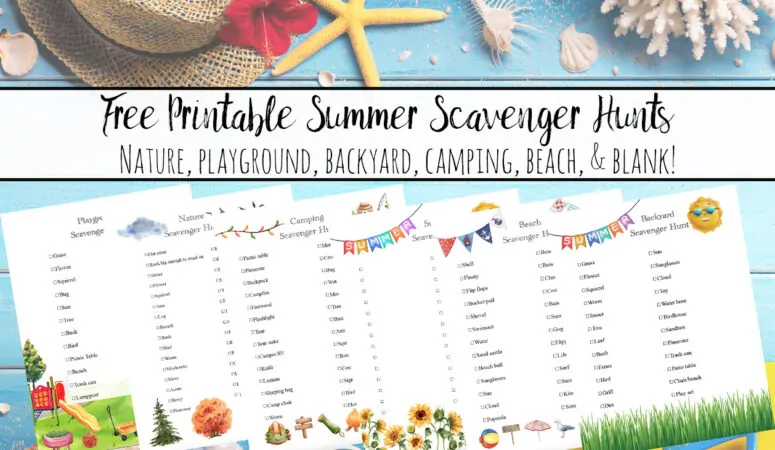 I have a new baby! And while he’s too young for scavenger hunts yet, I’m getting started on stuff to do in the future. And free printable summer scavenger hunts seemed like an easy activity. And since I was creating one, I figured “why not do six?” There are scavenger hunts for various summer activities: beach, nature walk, camping, and playground. There is also one for the backyard. And a blank one so you can make up your own stuff to find.