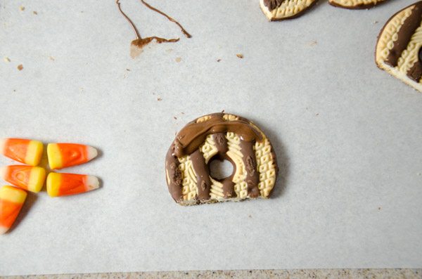 - Smear a small amount of chocolate around the top part of the cookie. It should be wide enough for 5 candy corns.