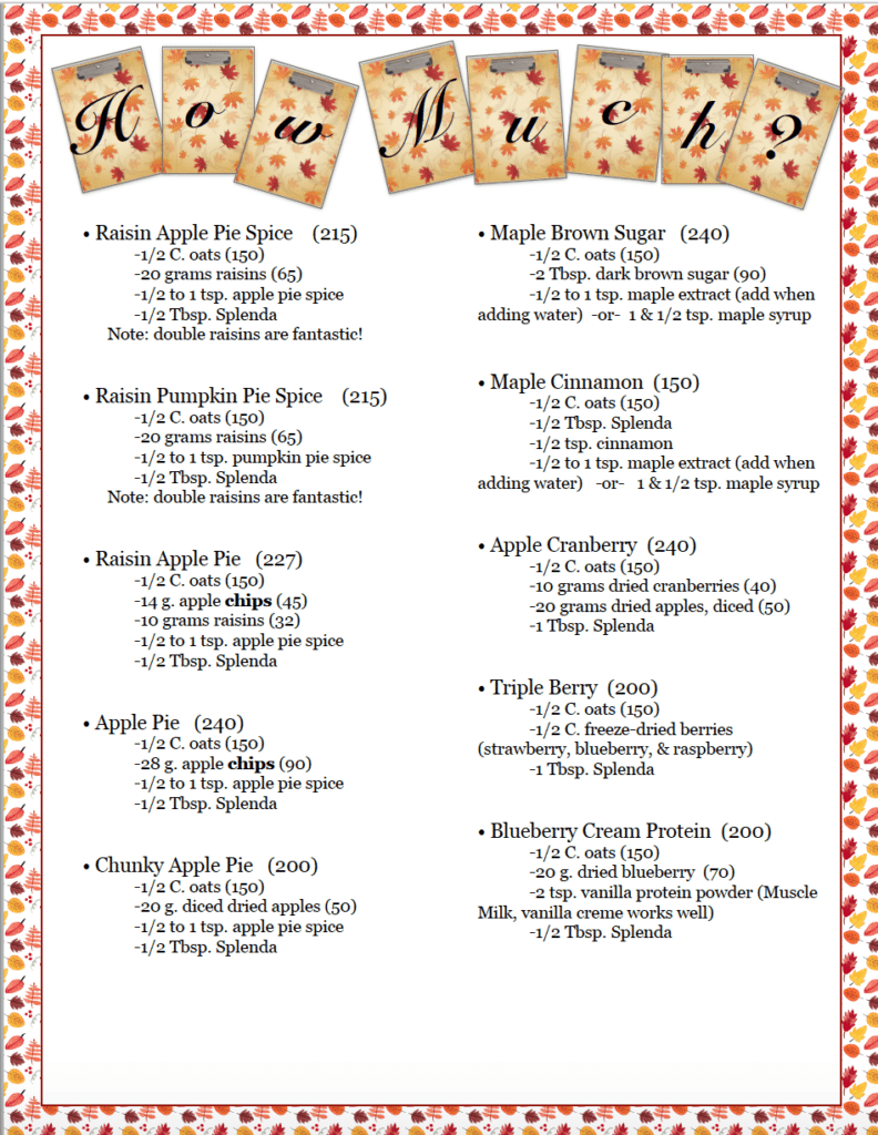 “Instant Oatmeal Jars” – I highly recommend visiting the original post. It has a TON of information about storage, oatmeal options, flavoring options, different fruit and nuts to add, etc. Below is a PDF of the various combinations suggested. Below that are the images included in said pdf.