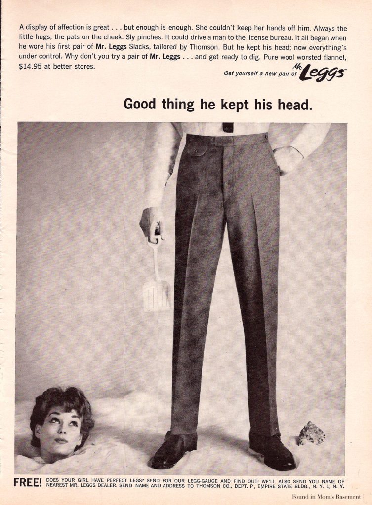 Ad text reads: A display of affection is great…but enough is enough. She couldn’t keep her hands off him. Always the little hugs, the pats on the cheek. Sly pinches. It could drive a man to the license bureau. It all began when he wore his first pair of Mr. Leggs Slacks, tailored by Thomson. But he kept his head; now everything’s under control. Why don’t you try a pair of Mr. Leggs…and get ready to dig. Pure wool worsted flannel, $14.95 at better stores.